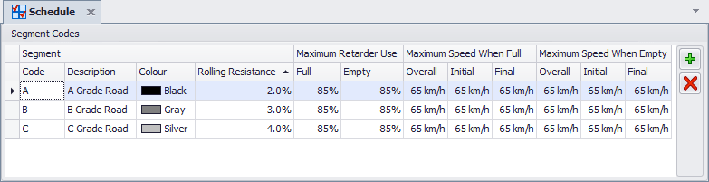 Add at least one Segment Code. Rolling resistance is controlled by Segment Codes which get applied to each segment along a haul profile. The primary properties of each "Segment" are Rolling Resistance and Speed Limits.