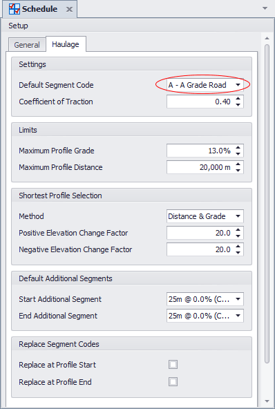 Return to the Schedule settings and switch to the Haulage Tab. Set a Default Segment Code (the most common Segment, usually what your established haul roads will be).