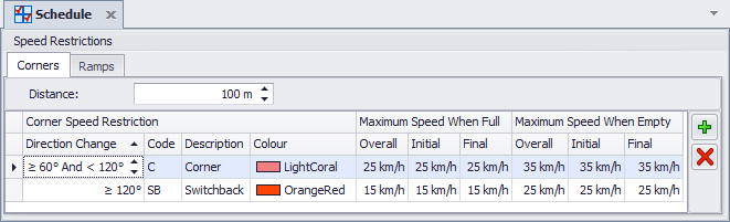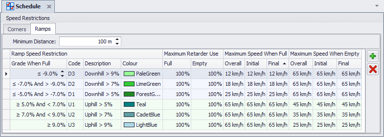 The Minimum Distance element in a Ramp determines how long a segment needs to be in order to have the restriction applied. In the example below distances of less than 100m would not have the Ramp restriction applied.