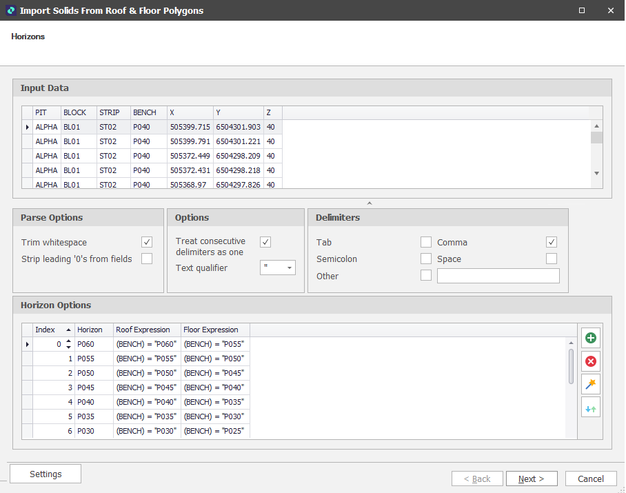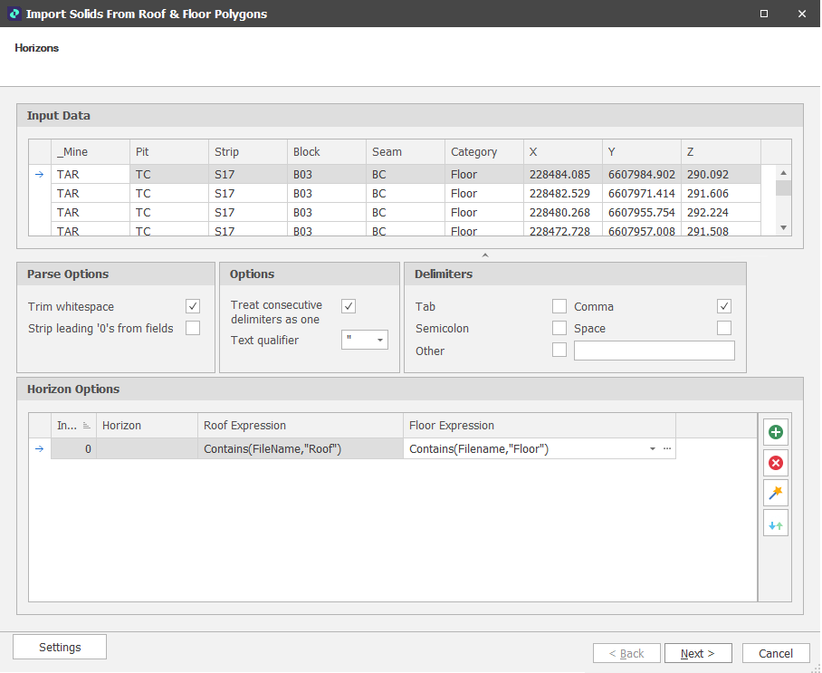 If you have only a Roof or Floor file (as opposed to both) you may need a set of Horizons similar to those shown in the screenshot below. Here, the Import Wizard