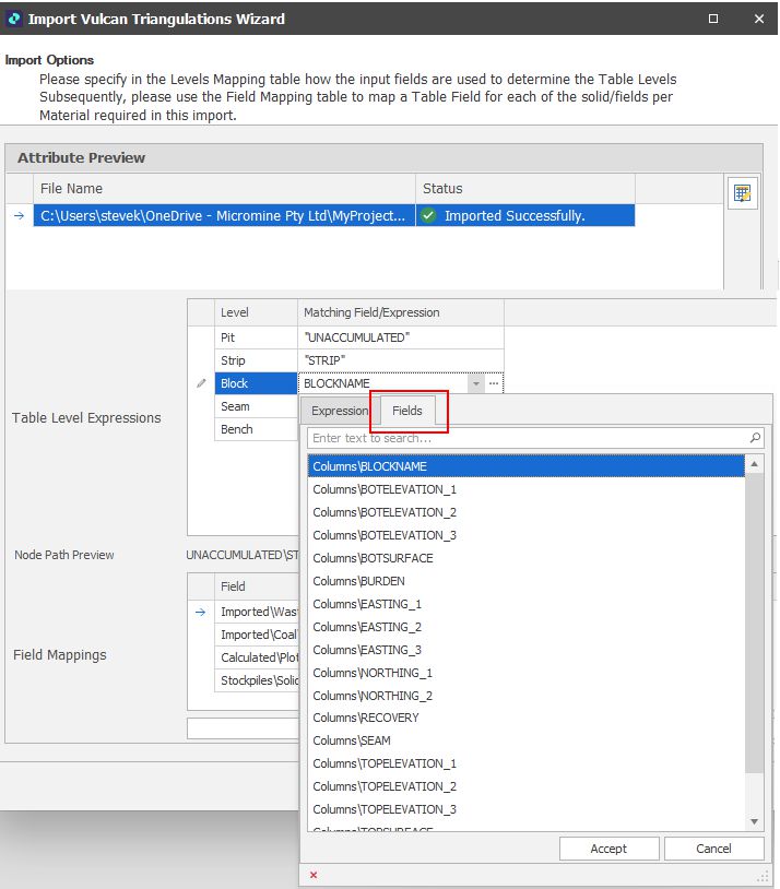 Use the Level Mappings table to map the level structure of the attributes in the imported solids to the levels in the table (i.e. Pit, Stage, Strip, Block, Seam, Bench).