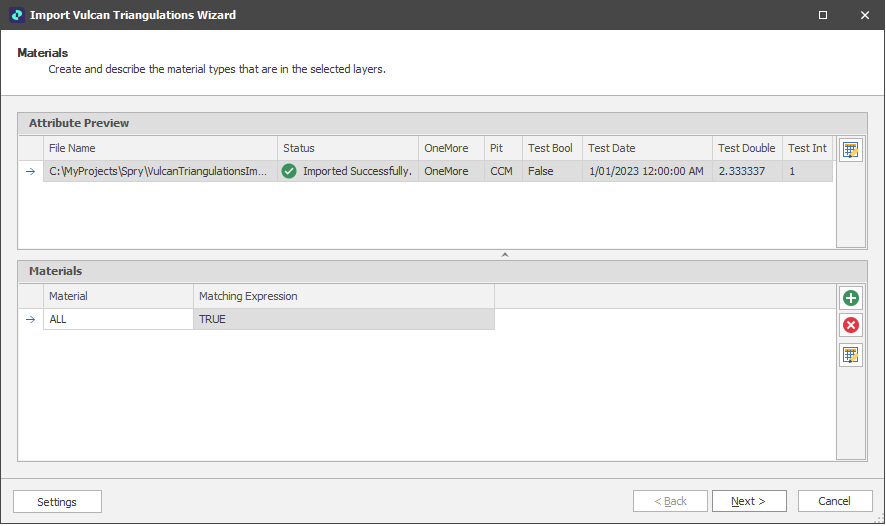 In the Import Wizard, the attributes for up to the first 10 files you have selected are shown in the Attribute Preview pane for review. It will also notify you if there have been any issues with importing the file. An option to view the attributes for all of the imported triangulations is available.