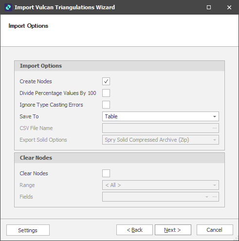 If you choose to save the imported triangulations to a CSV file, the option to export the generated solids alongside the CSV file is also provided. Choose an export format in which to save the solids (or select None).