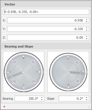 Click on the drop-down to view and if necessary adjust the XYZ coordinates, Bearing and Slope of the vector that was interactively defined. Attribute values will be enumerated in that direction.