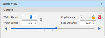 When the increment up/down controls are used to adjust the Width Ahead, Width Behind and Step Distance, or when the arrows on the Track bar are used to step in or step out, the camera is adjusted to show the new section in the Sectional View. The section position is also adjusted in the World View.