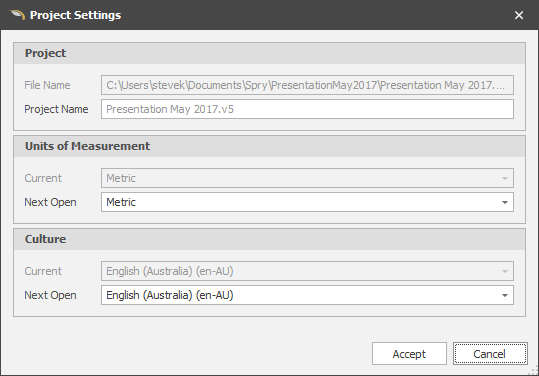 The Project File Name and Project Name are set when you create a project and these options are display only.