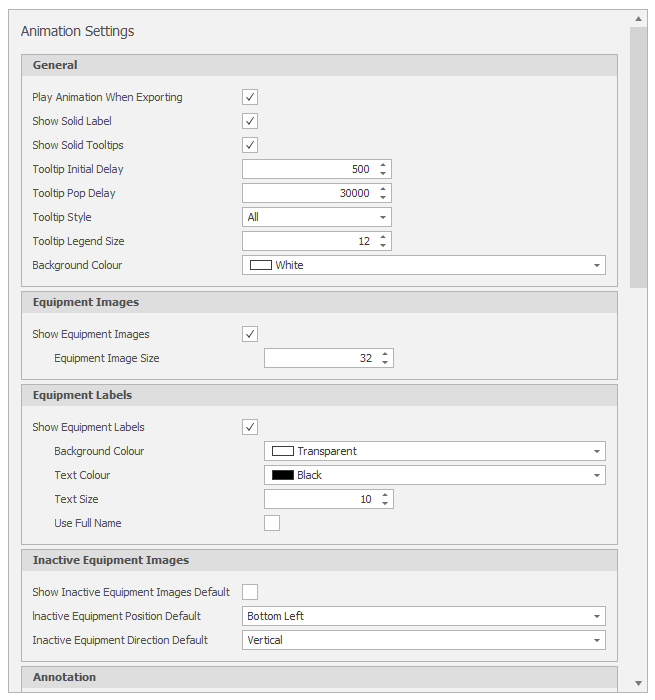 Use the options on the Animation Settings page of the Micromine Spry Settings window, to set animation settings, haul profile settings, highlight selected schedule steps, annotations, image, label and position options for active and inactive equipment, rendering, network connectivity and dependency options.