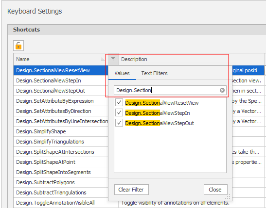 To find the actions you want to assign shortcuts to, click on the Name filter icon and enter your search text: