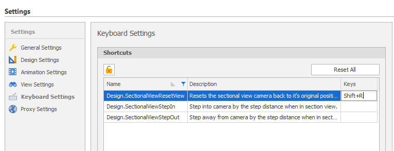 For example, you want to assign keyboard shortcuts to the Sectional View Step In/Step Out and Reset View commands: