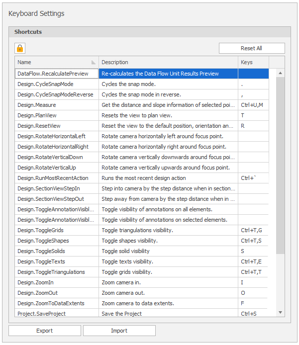 Use the options on the Keyboard Settings page of the Micromine Spry Settings window, to set keyboard shortcuts for the Design Window, Project Management and Scheduling.