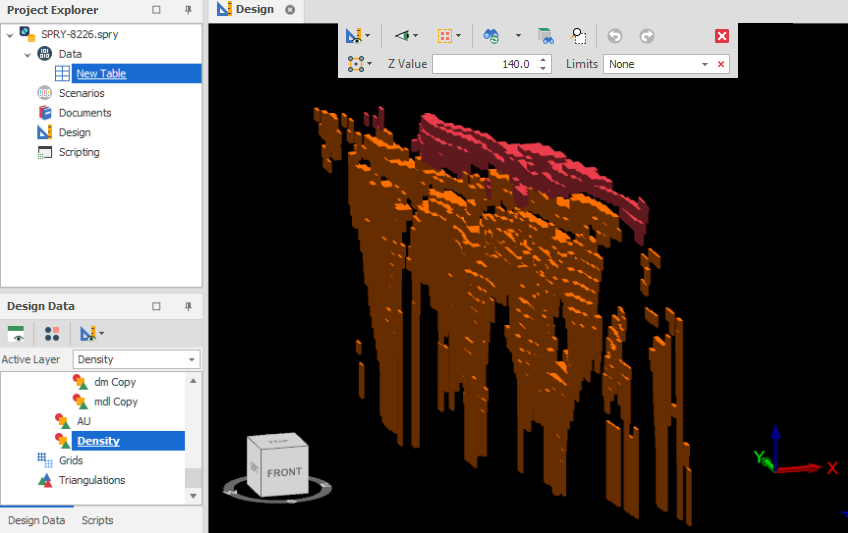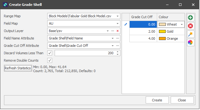 In the example screenshot below, with Remove Double Counts OFF, If a block has a AU value of 3, then it will be added to the triangulation of the Wheat AND the Gold coloured grade shells. since 3 is equal to or greater than the cut off value of those bins.