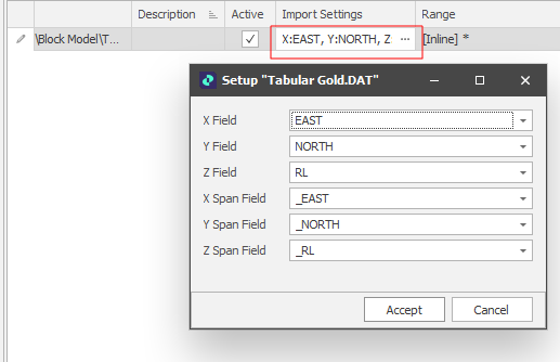 Click on the Import Settings ellipsis to choose how the data in the specified file will be imported. In this example, a Micromine Origin & Beyond Block Model file is being used for the interrogation: