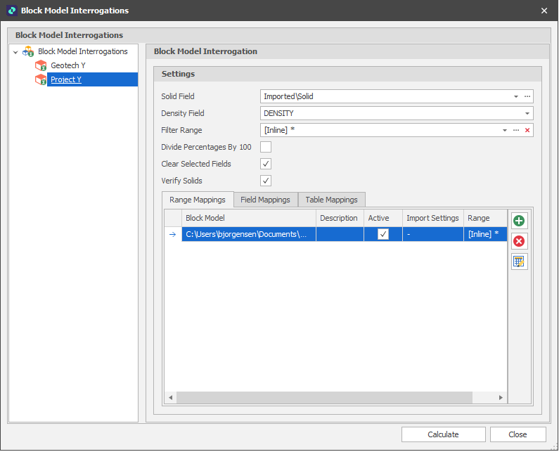 On the Range Mappings tab, below the Settings in the Block Model Interrogation dialog, specify the block model files that will be used for the interrogation. The data in each file is mapped to a specified range.
