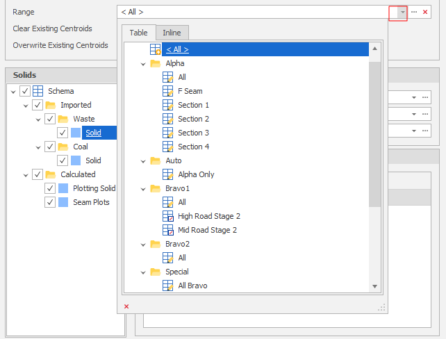To restrict the process to a picked range, click the drop-down control to use the Table View to filter the Nodes and/or the Levels you wish to include in the process.