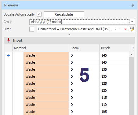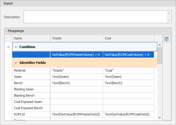 | Input | The input source data that has been retrieved from the underlying data table based on the Materials and Fields selected. See: Input Elements |