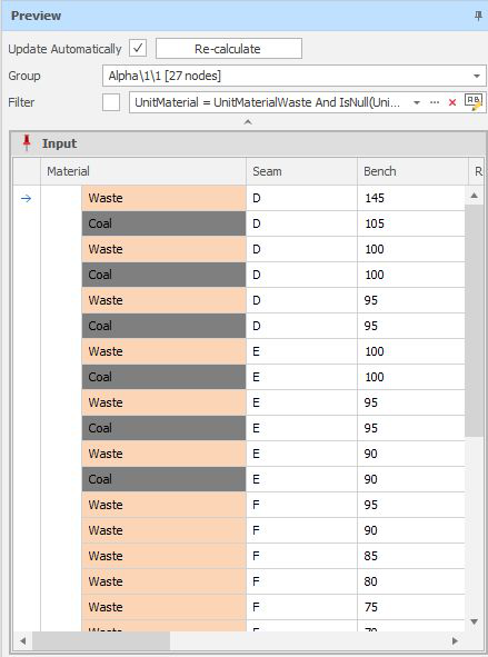 When an Input element is selected, the Preview pane shows the input source data that has been retrieved from the underlying data table.