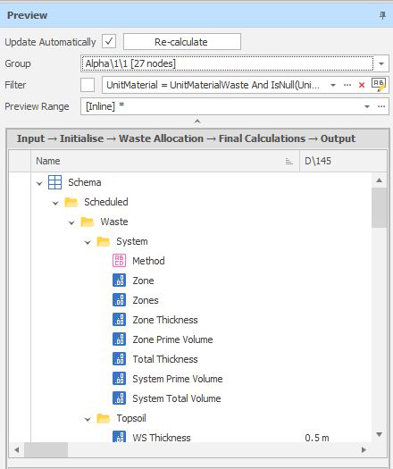 When an Output element is selected, the Preview pane shows the output (unit results) generated as a result of processing.