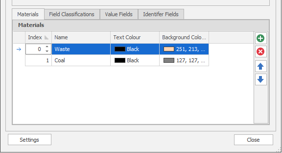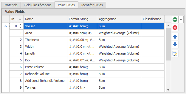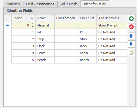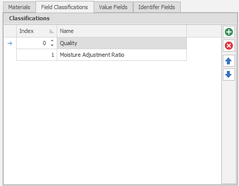 Materials, Field Classifications, Value Fields and Identifier Fields are defined on separate tabs:
