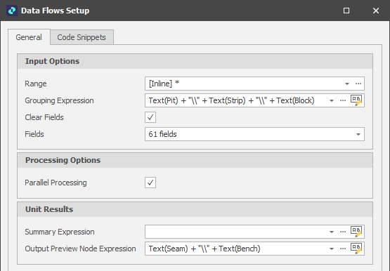 Note that data flows do not operate directly on the leaf nodes of the underlying data table, which belong to a rigid tree hierarchy. Instead, units are derived from the leaf nodes of the table and are able to be manipulated (merged or split) using expressions. A Summary Expression and/or an Output Preview Node Expression can be defined.