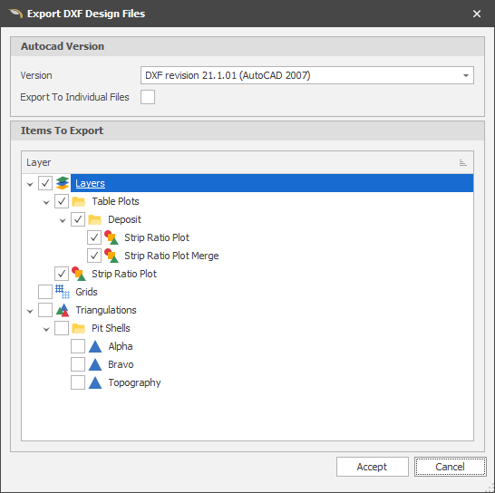 Alternatively, in the Design Data pane, right click on an individual layer, folder or group and select Export | DXF.