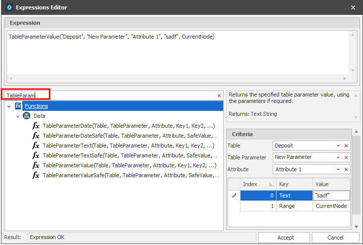 TableParameter Functions allow you to build lookup functions by pulling data directly from Table Parameters. In the Expression Editor, use the Criteria helper panel to build your expressions: