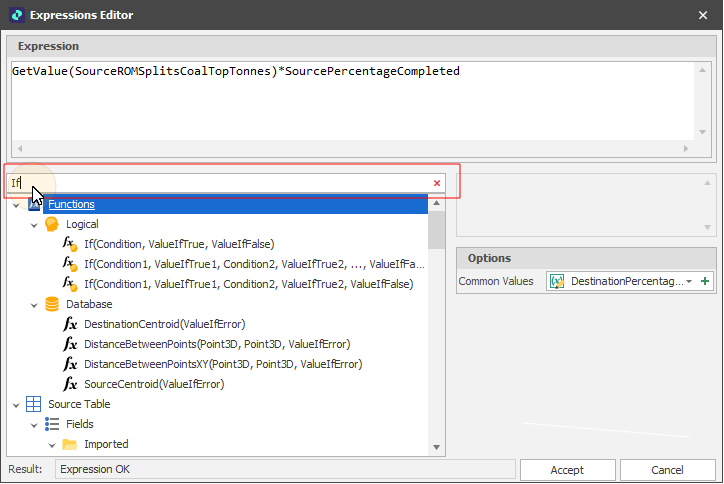 One of the most useful tools in the Expression Editor is the ability to search the Functions and Variables available using the search bar. If you know roughly what you require, start typing in the search and the results will narrow.