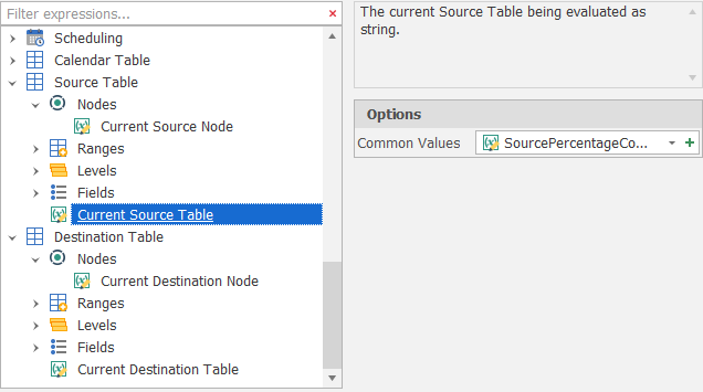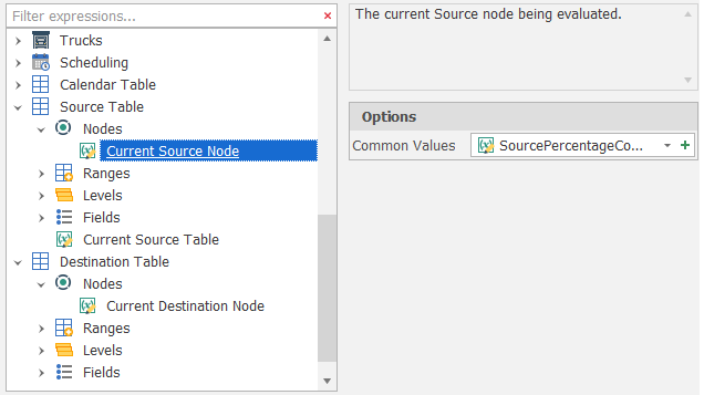 The Options that are available in the Expression Editor will depend on the (Field, Attribute) type of node selected or the function selected. See: Options