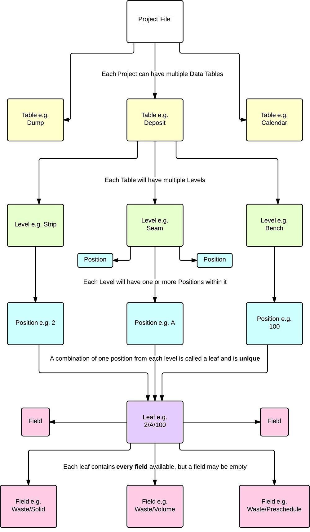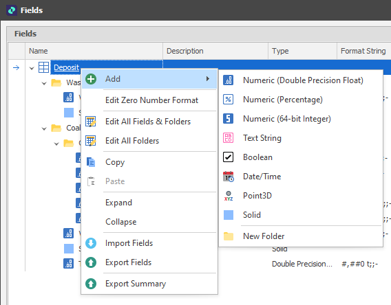 - Numeric (Double Precision Float): Any number including decimal places. Common examples include physical properties (Area, Thickness, Volume, Tonnes etc.) and equipment rates