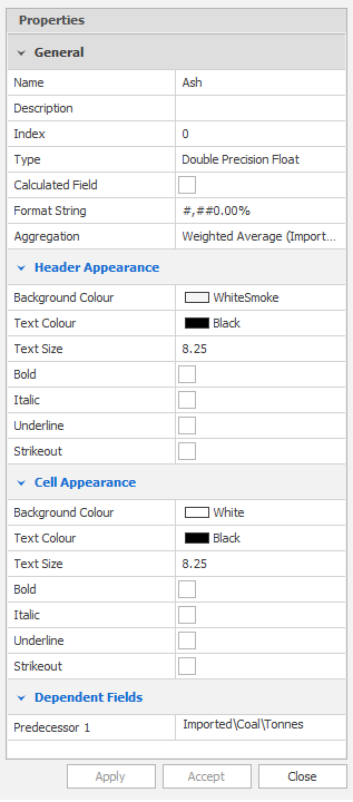 - Aggregation: For fields that support Aggregation, this controls the way data is summarised when displayed at a higher level than the lowest.