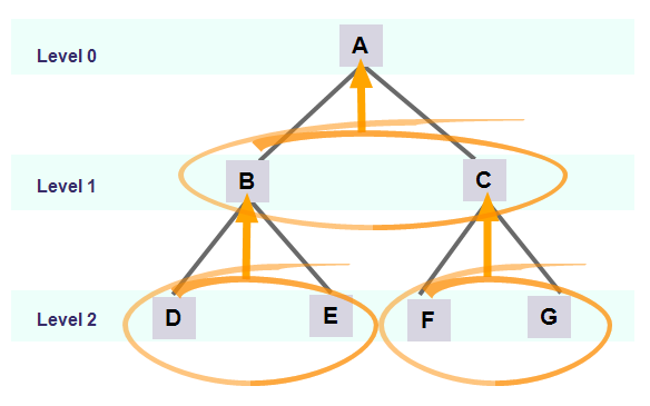 In the following example, field values at Nodes D and E are aggregated and the aggregated result goes to Node B. Similarly, field values at Nodes F and G are aggregated and the aggregated result goes to Node C.