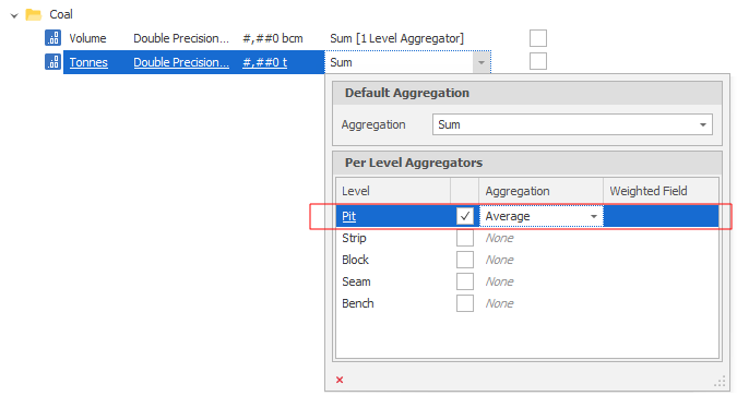 Typically, the same default aggregation method for a field is applied at all levels, however the option to select a different aggregation method per level is available as part of the aggregation properties of a field: