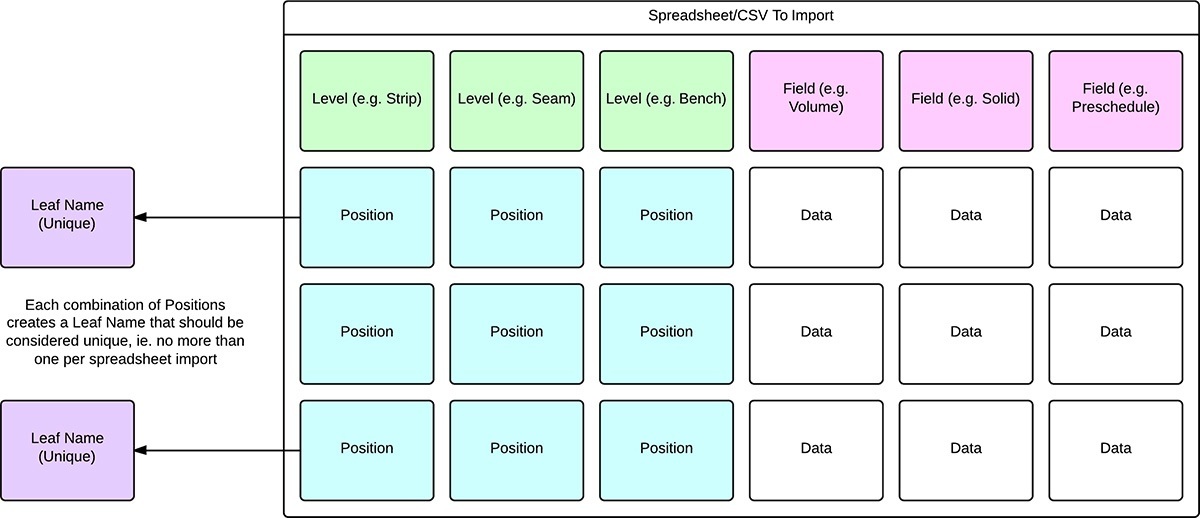 The application handles data import through Excel style spreadsheets as either an .xls, .xlsx or .csv file type. Each row in the spreadsheet requires a unique Leaf Name which maps the position of the data in the tree structure, as illustrated below.