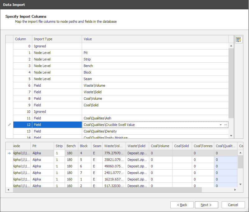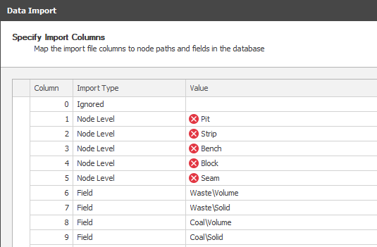 In the Specify Import Columns window, check/assign the associations of your Levels and Fields. The header of your data file is read by the application and any exact matches (Folder and Name) to your Level and Field names will be associated automatically: