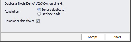 It is recommended that these are not ignored OR replaced but that you click Abort, look at your data and correct it. Duplicate Leaves almost never result in an accurate data import.
