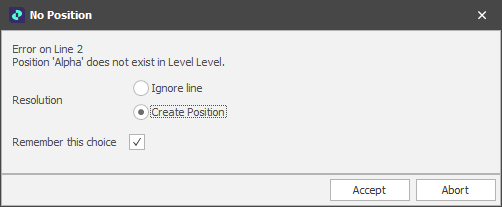 After clicking Next, if abnormal data is detected, one of several warning prompts may be displayed. The first shows the prompt when a Position is not present inside a Level.