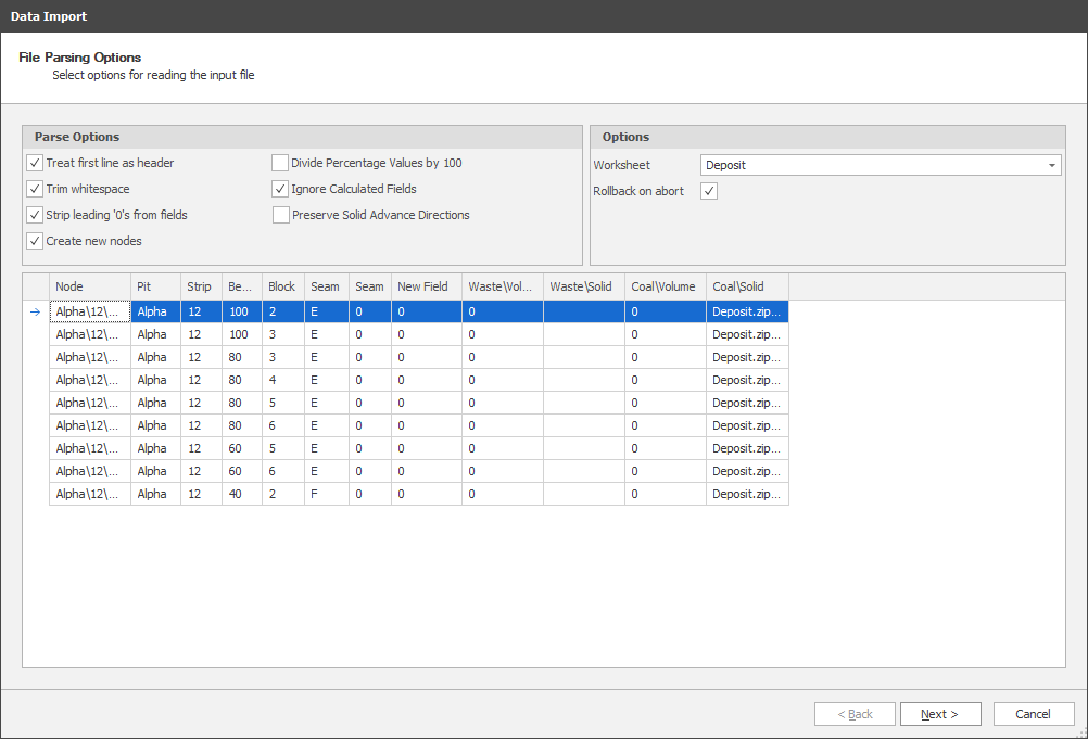 The File Parsing Options window provides a preview of your data and the options which determine how the application will read the data. For Excel files, this involves the specification of a Worksheet. When invalid data is detected, you can also select an option to rollback any table changes on abort. Use the Row-Column Preview window to determine how to parse the file: