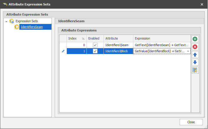 2. Values in the Index column are read-only. To change the order or the number of the Expressions in the Set, use the tools provided on the local toolbar: