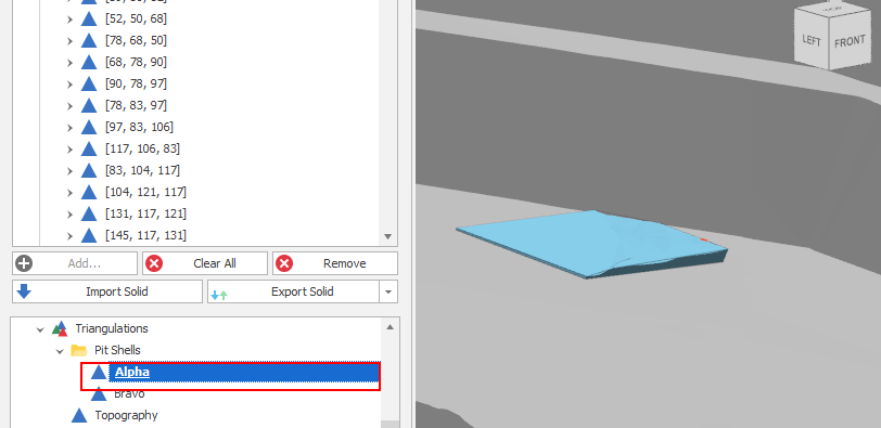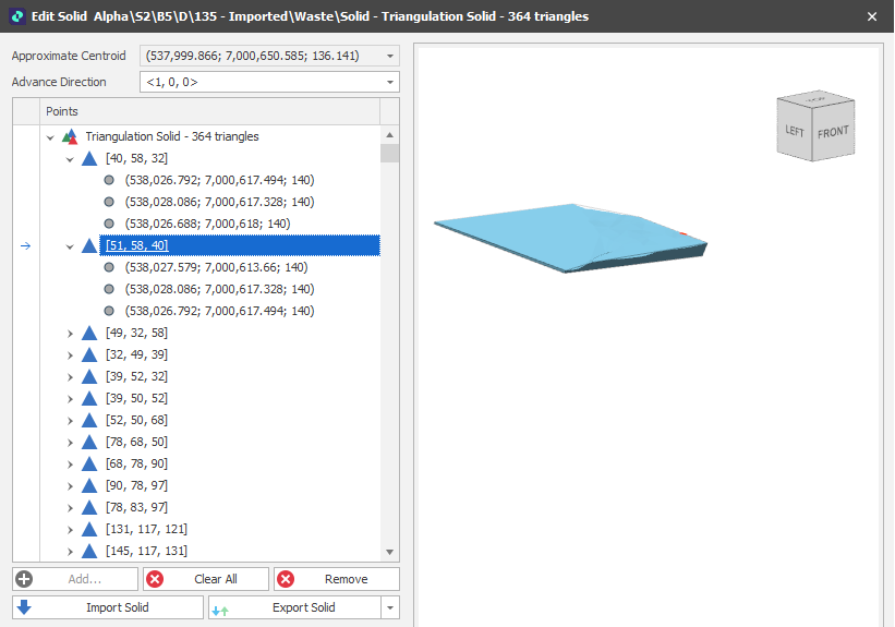 Click Export Solid to export the current solid to a Micromine Spry solid file. The Full Node or Leaf of the current solid is used as the default name of the export Solid file. For example: Alpha_S2_B5_D_135 Imported_Waste_Solid.solid |