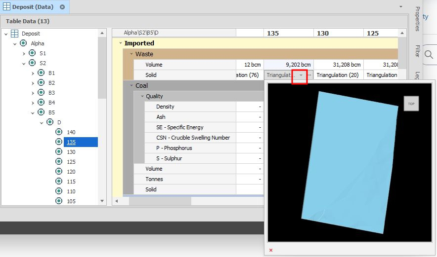 The solid associated with a leaf can be previewed and edited via the Table View. Click the drop-down in the field header of a Solid field to see a Solid Preview.