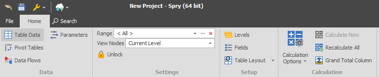 When a table is open, the ribbon is changed to show groups applicable to a data table. The layout and aggregation of the data is set in the Fields and Levels setup for the Table.