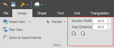 When a sectional view is open, input boxes allow the Section Width and Step Distance to be edited. Step In and Step Out tools allow the Step position to be adjusted.