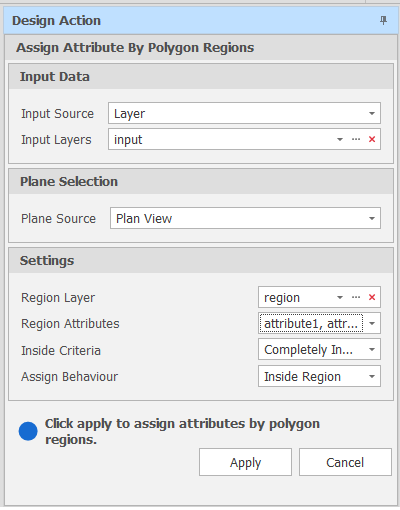 If an element is outside the specified region(s), the specified region attributes are assigned to the element. Note: It is recommended that you do not use this tool where you have regions which overlap. If selected elements fall within more than one region, the attributes of the last region encountered are most likely assigned, however this is undefined behaviour and the assignment may be unpredictable.