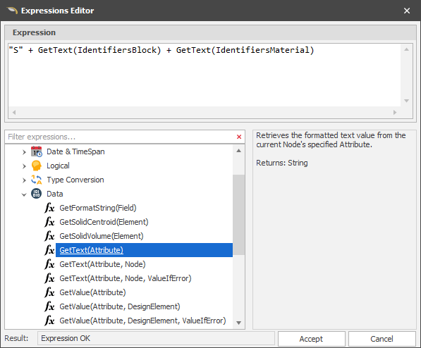 A Preview of the result of the expression is shown. For example, "S" plus the concatenation of Block Identifier and Material Identifier: