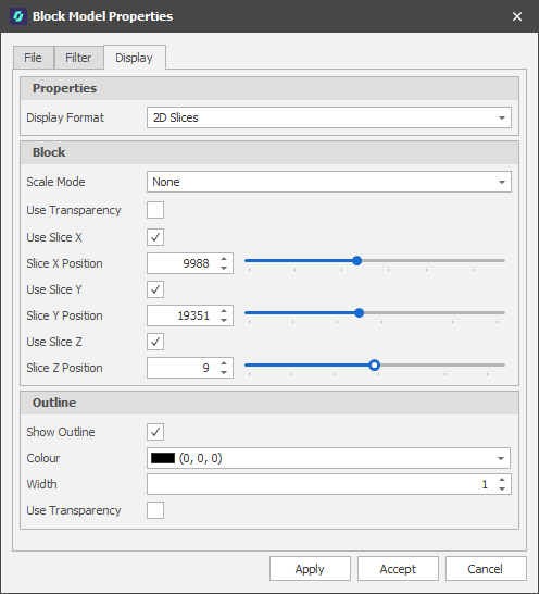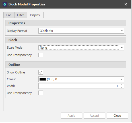 Use the settings provided on the Display tab of the Block Model Properties dialog to set the appearance of your block model.
