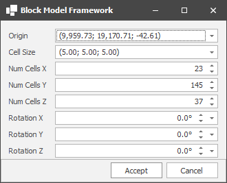 Click Accept to Apply the changes you have made to the framework and close the Block Model Framework dialog.