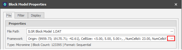 To view or edit the Framework, on the File tab of the Block Model Properties window, click the ellipsis to the right of the Framework input box:
