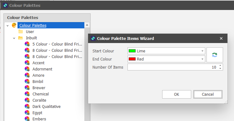 You can view Inbuilt colour palettes and create or edit user-defined colour palettes when you click the Edit Palettes ellipsis to the right of the Palette selection box in the Colour Palette window: