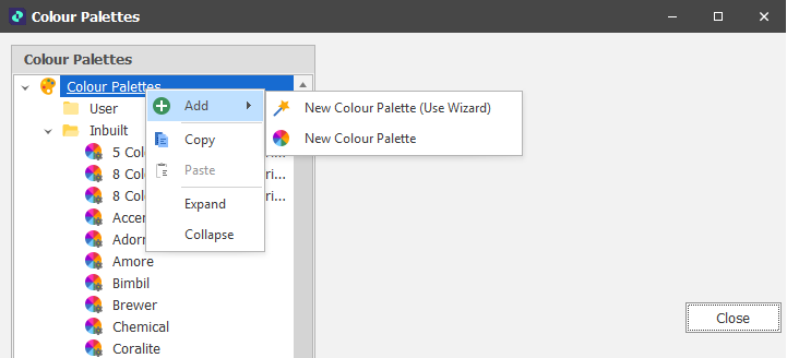 Right-click on the Colour Palettes node to Add a New Colour Palette under the User folder: