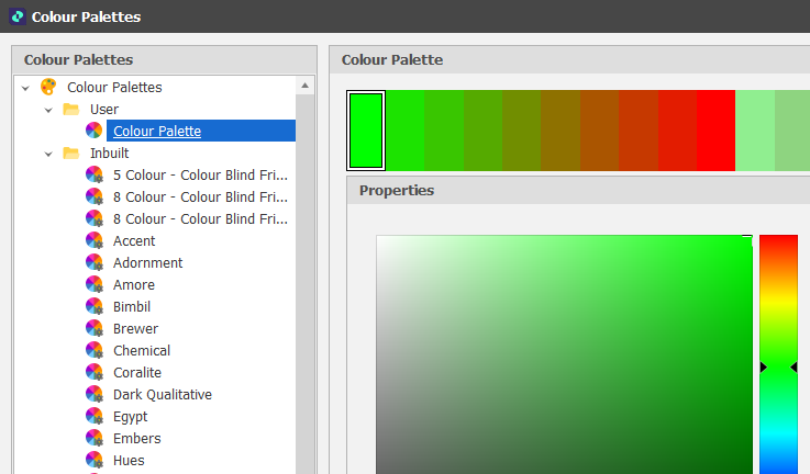 Click on a palette in the left-hand pane of the Colour Palettes window to see the properties of that palette: