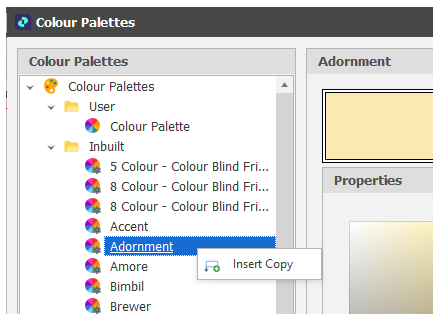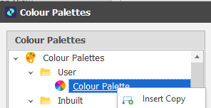 Note that you cannot add a palette to the Inbuilt palette folder, nor can you edit an Inbuilt palette. However you can right-click on an Inbuilt palette and select Insert Copy to insert a copy of that palette into the User folder. The copied palette can then be edited as a User palette.